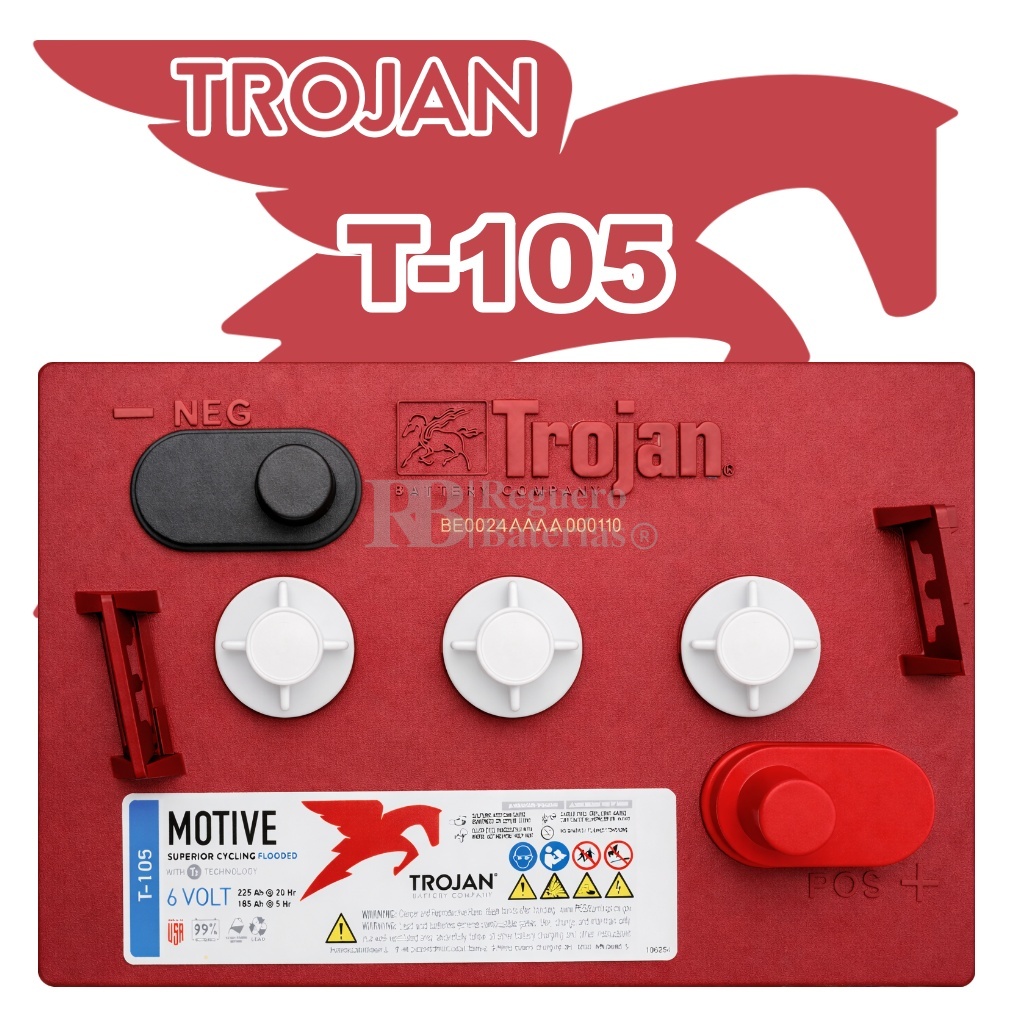 La batería Trojan T-105 es una batería de plomo-ácido inundada, diseñada principalmente para aplicaciones de ciclo profundo, como en sistemas de energía solar, carritos de golf, maquinaria industrial como plataformas elevadoras o vehículos de limpieza y otros equipos que requieren una descarga constante y prolongada.