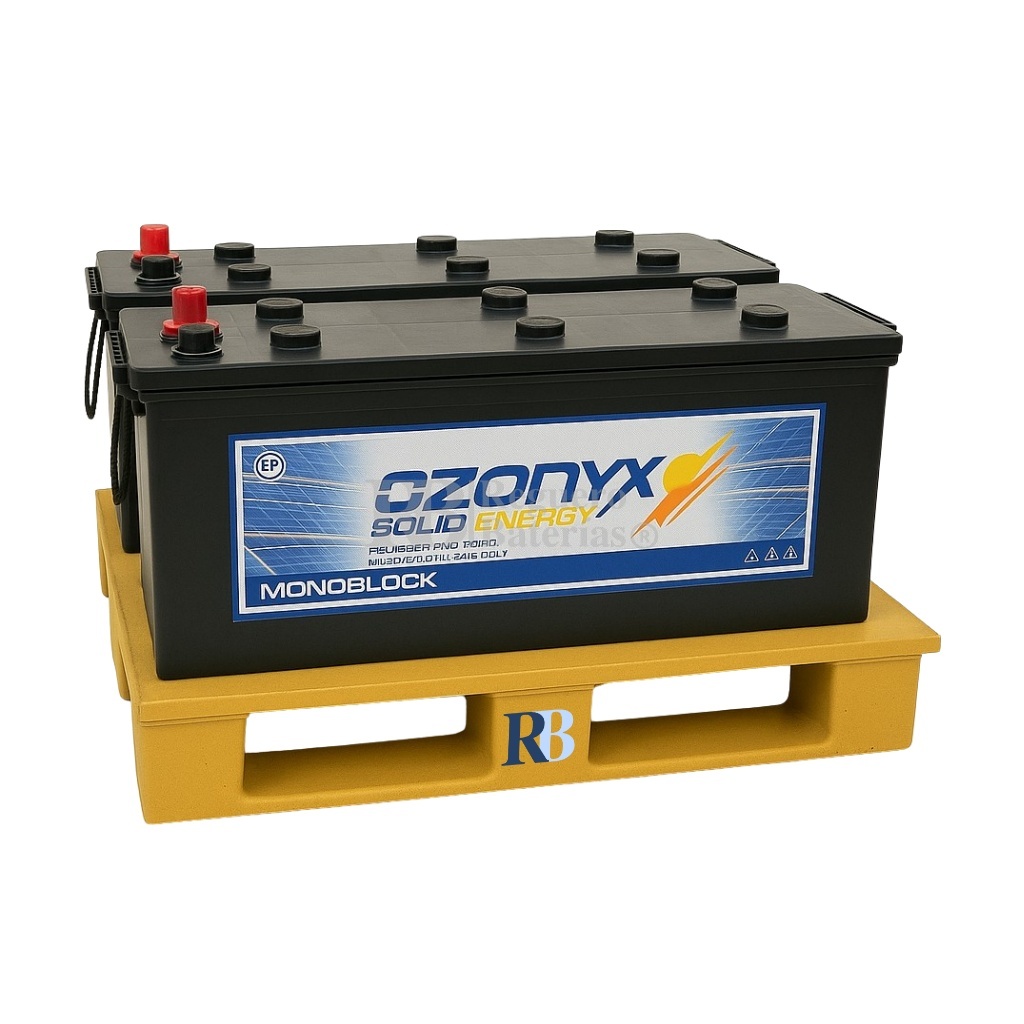 Kit de 2 Baterías con mantenimiento Ozonyx Monoblock para instalaciones solares en 12 Voltios 250 Amperios