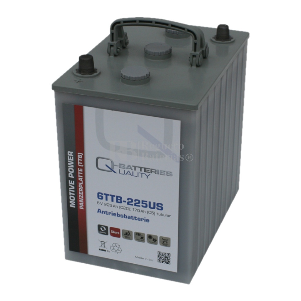La batería Qbatteries 6TTB-225US es una batería de plomo-ácido inundada de la serie TTB, con placas tubulares positivas (tecnología de placa blindada / PzS). Está pensada para ciclo profundo y uso exigente en aplicaciones de tracción como carros de golf, maquinaria de limpieza, plataformas elevadoras móviles y transpaletas eléctricas, ofreciendo rendimiento fiable y larga vida útil.