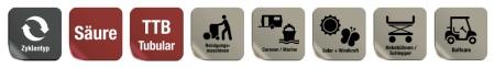 • Placas positivas tubulares (PzS) de alta resistencia a ciclos y descargas profundas.