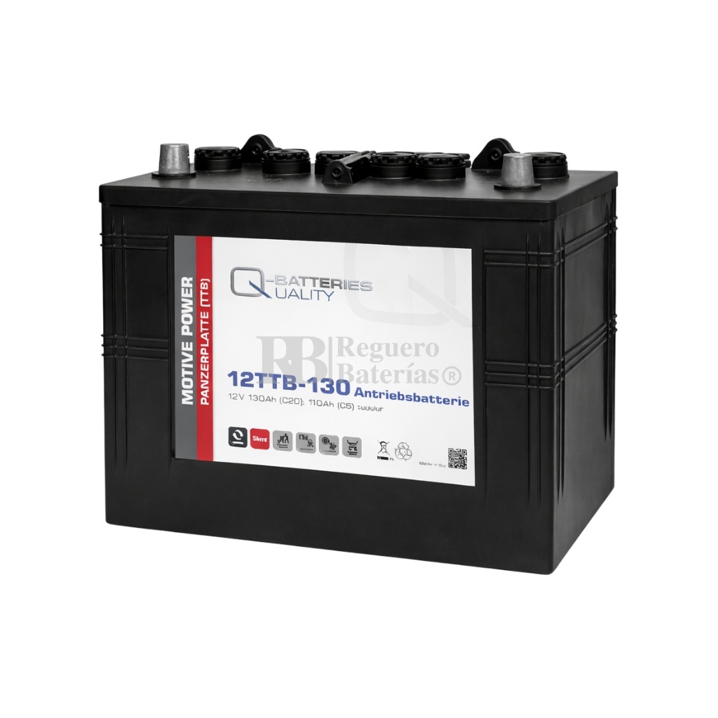 La batería Q-Batteries 12TTB-130 pertenece a la serie TTB y utiliza tecnología de placas tubulares positivas (PzS) con electrolito líquido. Está diseñada para ciclo profundo y un servicio fiable en aplicaciones profesionales como maquinaria de limpieza, plataformas elevadoras, vehículos de manutención y sistemas solares.