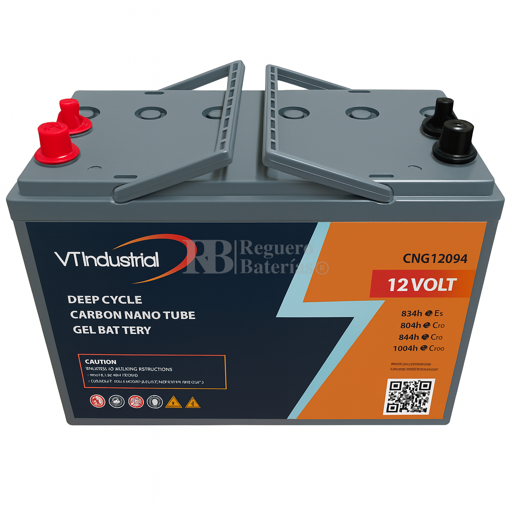 Batería CNG12094 12 Voltios 94Ah (C20) – Carbon Nano Gel Deep Cycle La batería CNG12094 forma parte de la gama profesional de baterías de ciclo profundo con tecnología Carbon Nano Gel, especialmente diseñada para aplicaciones que demandan alta durabilidad, bajo mantenimiento y un excelente rendimiento energético. Su diseño sellado y libre de mantenimiento la hace ideal para sistemas solares, vehículos eléctricos, plataformas de trabajo, telecomunicaciones y aplicaciones marinas o recreativas.