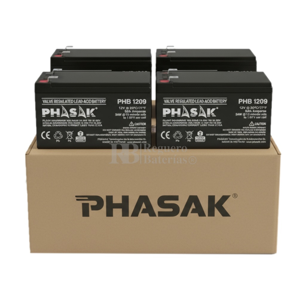 Embalaje compuesto de 4 baterías Phasak PHB-1209, 12 V 9 Ah AGM (VRLA) – para SAI Phasak Online Rack PH 9320, Alto rendimiento para aplicaciones de alta descarga.