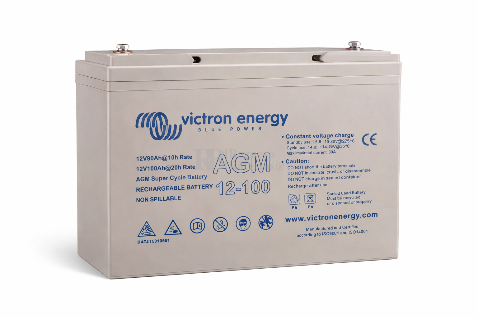 La Victron Energy AGM Super Cycle 12 V 100 Ah es una batería de plomo-ácido sellada con tecnología AGM Super Cycle, diseñada para aplicaciones que requieren una alta resistencia a ciclos profundos de descarga y una fuente de energía fiable y estable. Su construcción VRLA evita fugas de electrolito y elimina la necesidad de ventilación especial, lo que permite su instalación en interiores o espacios con ventilación limitada.