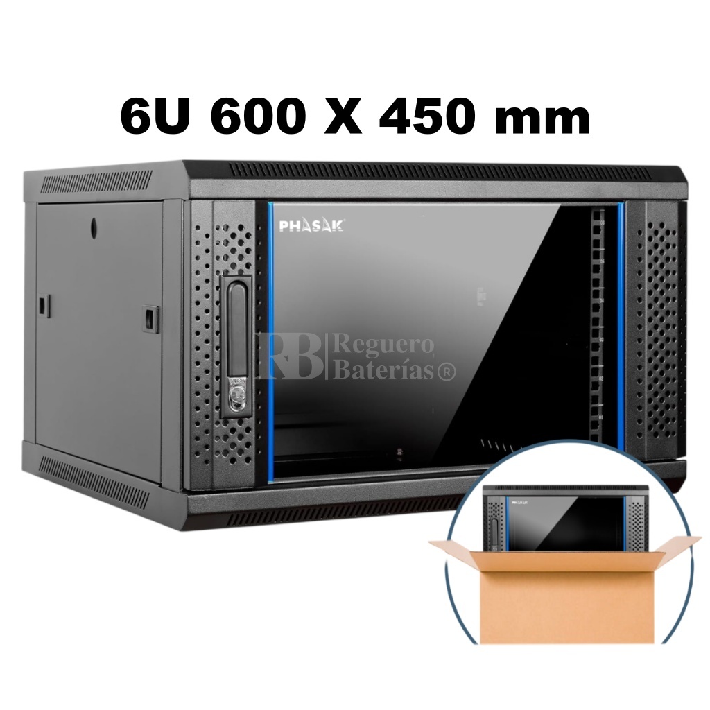 El Rack mural PHASAK Pro 19″ PHO 2106 se sirve premontado con puerta de vidrio templado, ventilación mejorada y cerradura de seguridad. Incluye bandejas y regleta 19″ para instalación profesional.