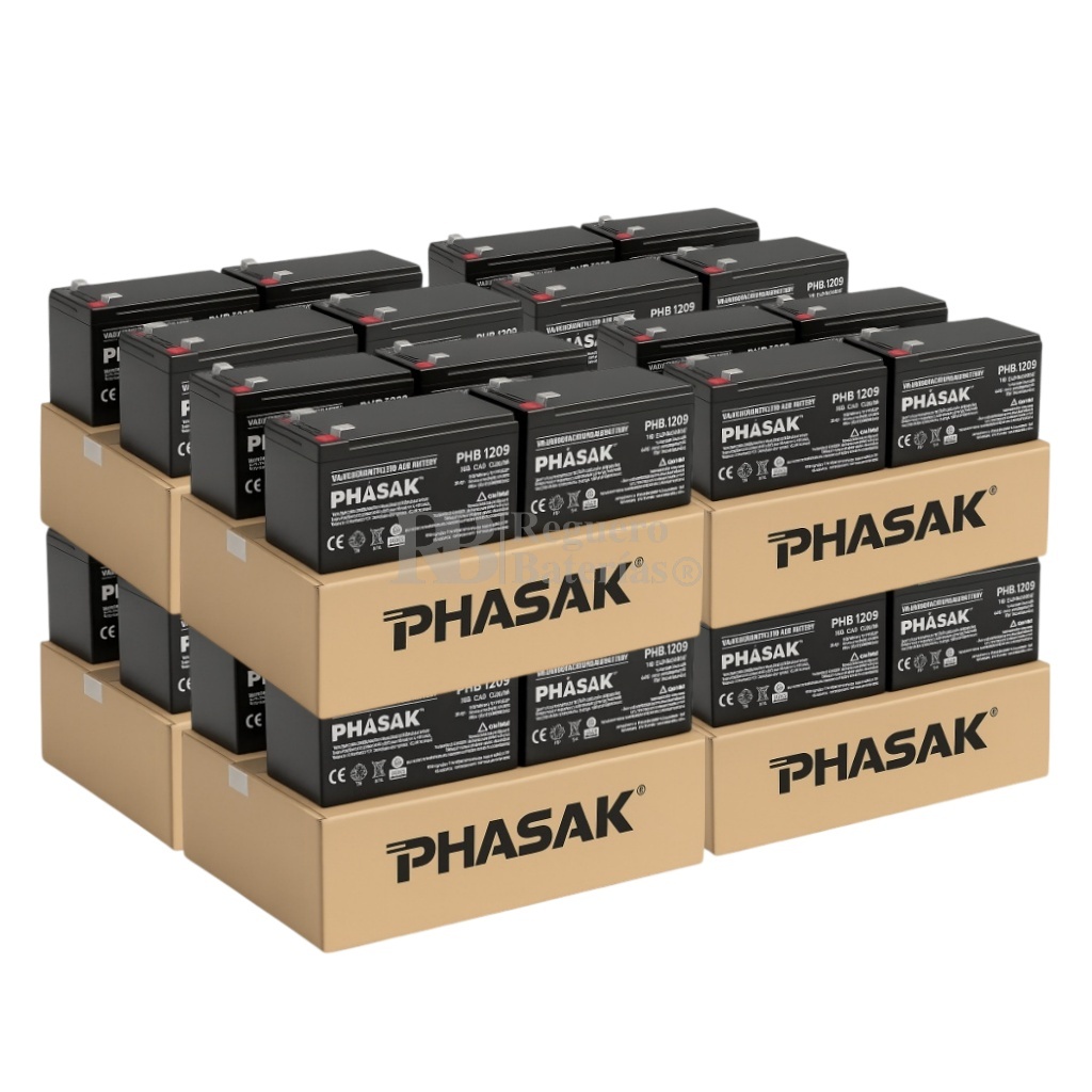 Embalaje compuesto de 16 baterías Phasak PHB-1209, 12 V 9 Ah AGM (VRLA) – Alto rendimiento para aplicaciones de alta descarga.
