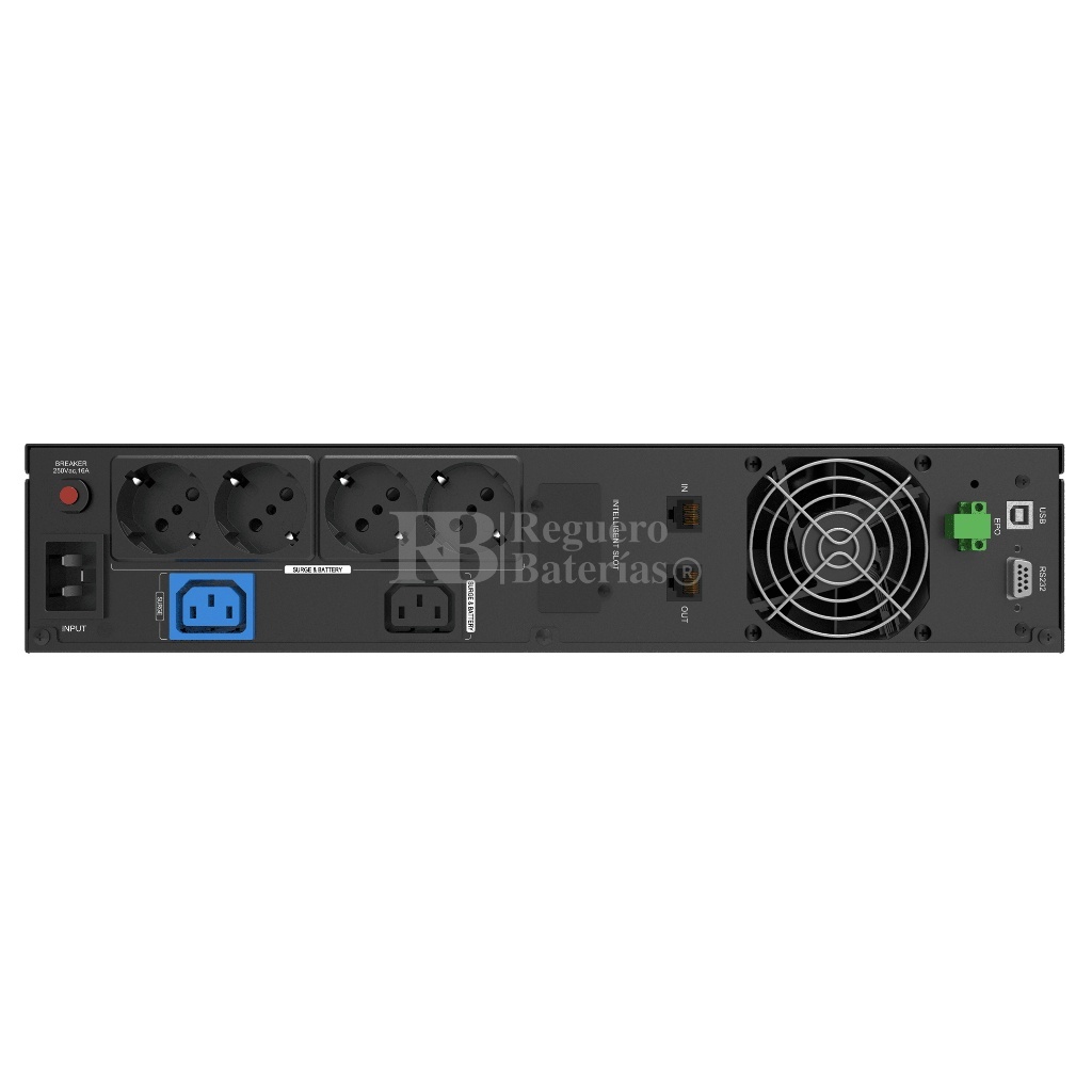 • Salidas: 4x Schuko, 2x IEC (1x Surge Protect), RJ45, USB HID, EPO, RS232, SNMP (Opc)