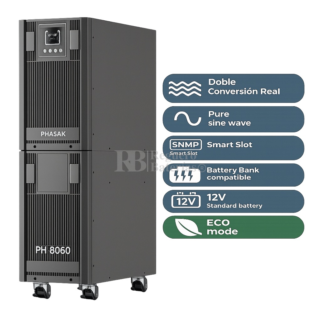 El SAI PH 8060, integrado en la gama Basic Pro Online, proporciona una potencia nominal de 6000 VA mediante tecnología online de doble conversión, asegurando un suministro eléctrico continuo, estable y de alta calidad. Este sistema garantiza la regulación precisa de tensión y frecuencia, protegiendo los equipos frente a fluctuaciones, picos de tensión, microcortes y fallos en la red eléctrica.