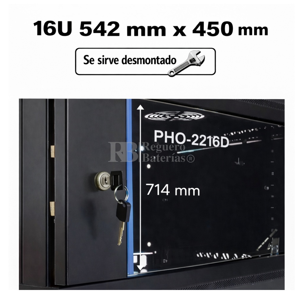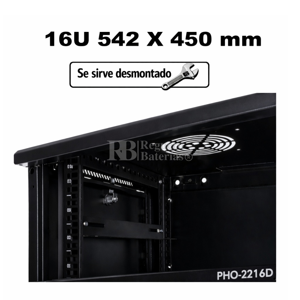 Armario desmontado Phasak ECO 2216-D 16U de altura, 542mm de ancho x 450 mm de fondo.