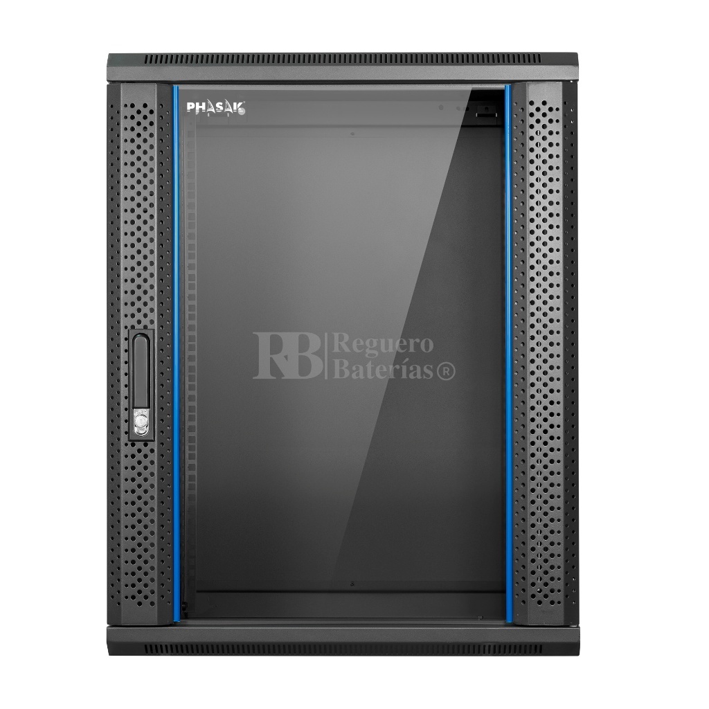 El Rack mural PHASAK Eco se suministra desmontado (Flat Pack), es ligero y de montaje rápido con puerta de vidrio templado, y cerradura con bombin convencional.