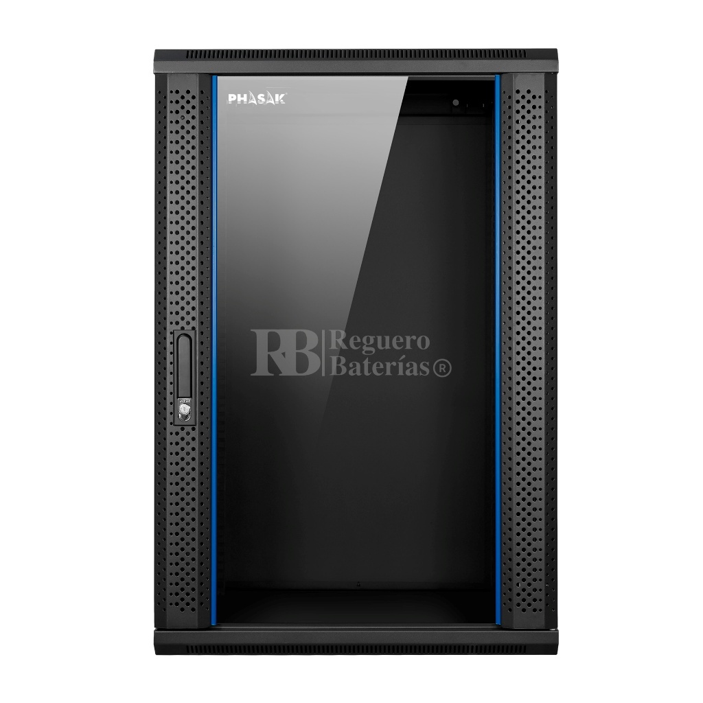 El Rack mural PHASAK Eco se suministra desmontado (Flat Pack), es ligero y de montaje rápido con puerta de vidrio templado, y cerradura con bombin convencional.